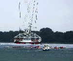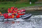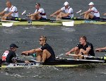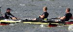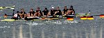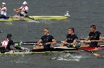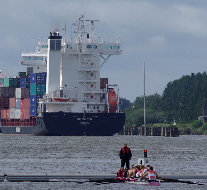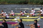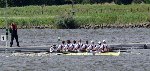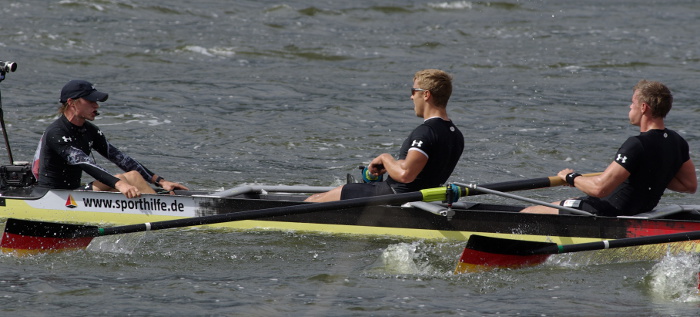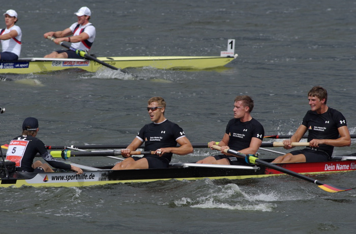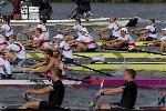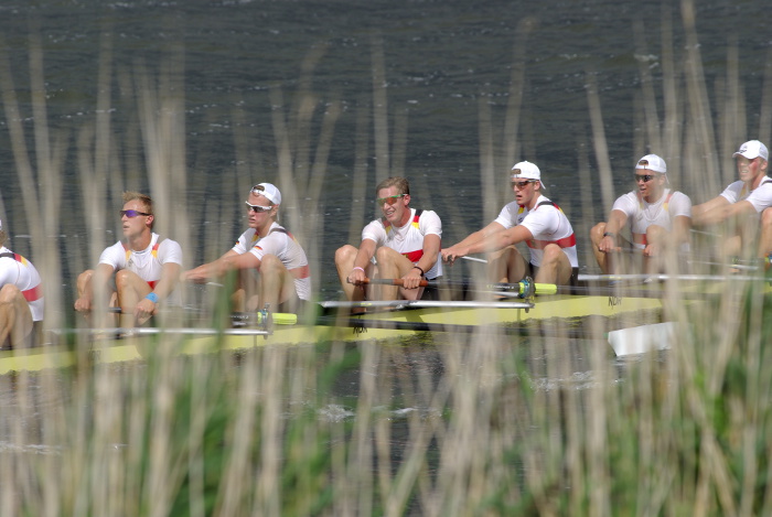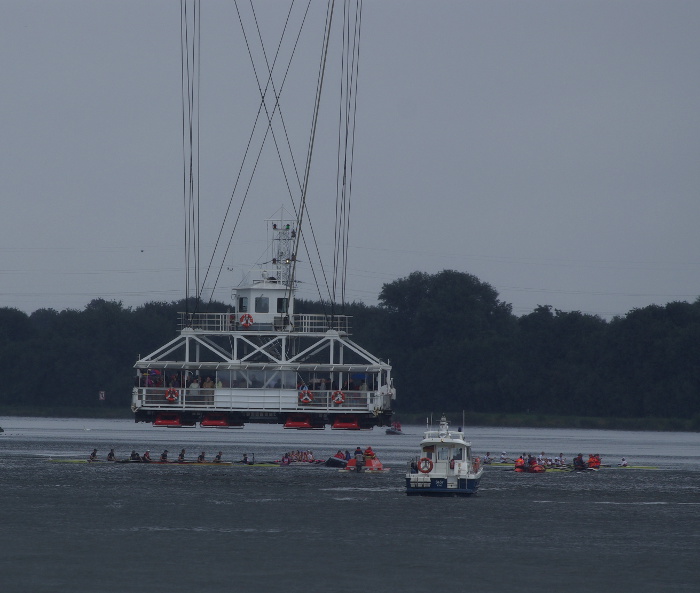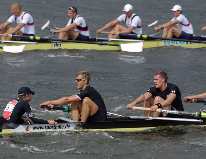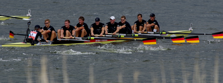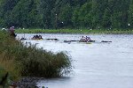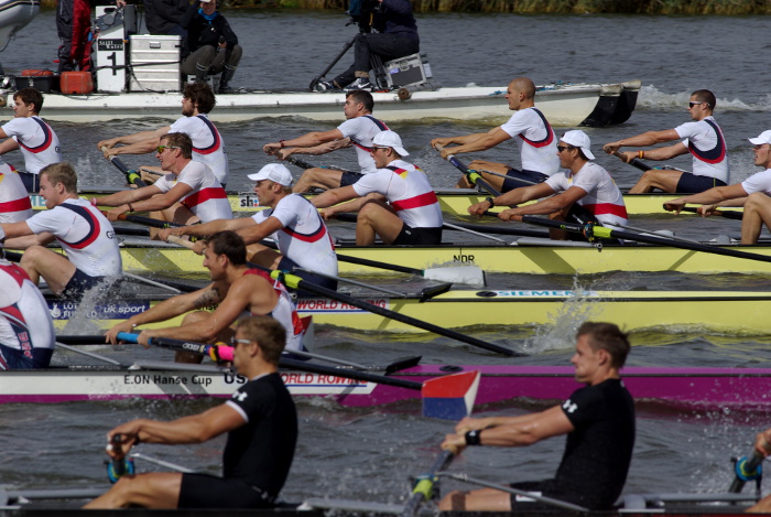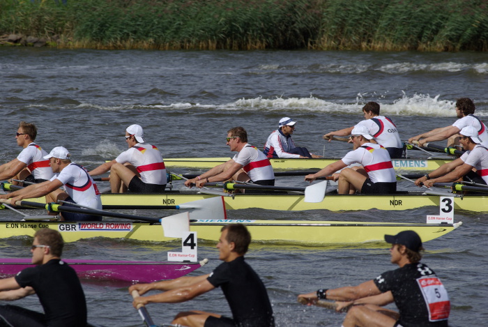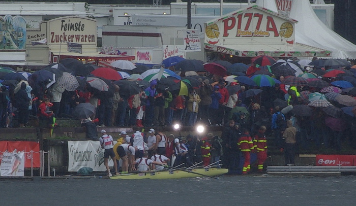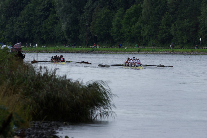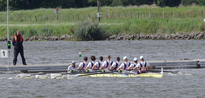 Mit dicken Pötten am Start.Die Ampel ist grün, es geht los.Am Anfang sind alle 5 Boote noch eng beisammen,und die Ruderer noch frisch.Der Steurermann sitz nur rum,während die Anderen kräftig durchziehen müssen.Dann Ruderblätter aus dem Wasser und laufen lassen.Alle Mann des Deutschlandachters.Der deutsche U23 Achter, versteckt hinter Schilf.Das Feld hat sich gelichtet, Großbritannien biegt vor Deutschland um die Kurve.Der Schlagmann des USA Achters.Die Helfer des DLRG immer hintern den Booten her.An der Rendsburger Hochbrücke und Kanalfähre war das regnerische Ziel.Als Ruderer hat man keinen Schirm, viele Zuschauer schon.