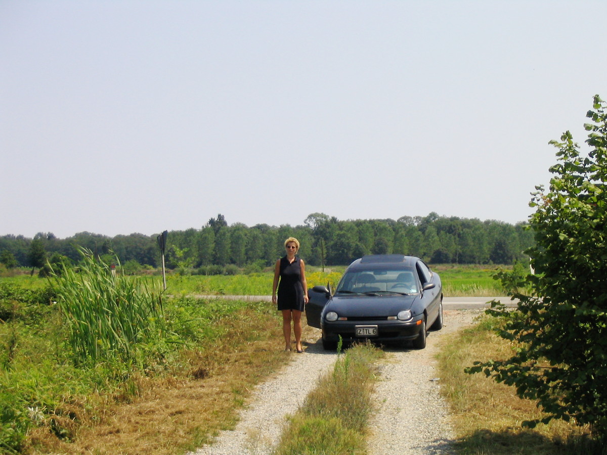 Dörte mit Neon bei Reisfeldern in der Poebene, Italien 2003